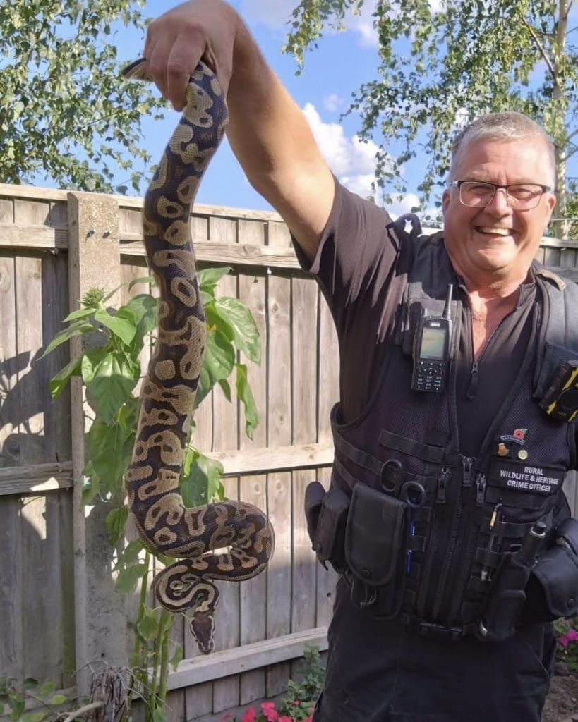 In this case, the reptile had slithered partially behind a pond and down a hole, making it difficult to identify. One of the “older and braver” officers managed to coax it out with some cold water, revealing a huge Royal Python.